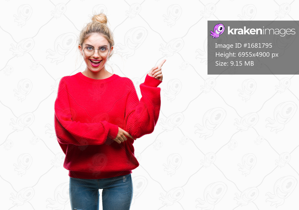 Young beautiful blonde woman wearing red sweater and glasses over isolated background with a big smile on face, pointing with hand and finger to the side looking at the camera. - Kraken Images