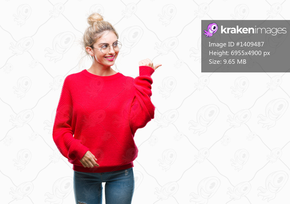 Young beautiful blonde woman wearing red sweater and glasses over isolated background smiling with happy face looking and pointing to the side with thumb up. - Kraken Images