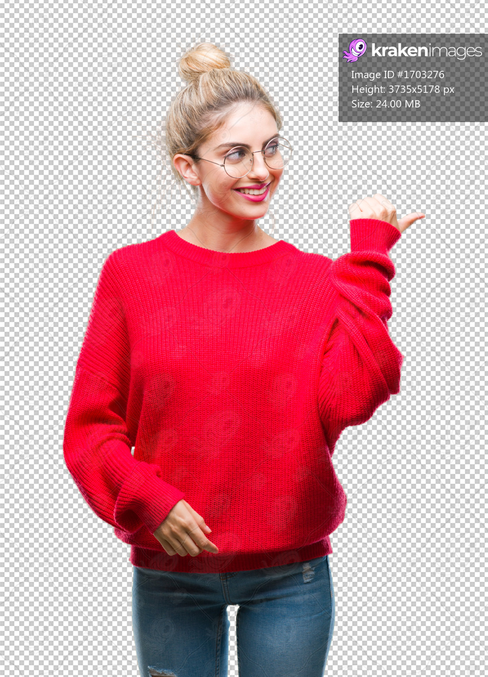 Young beautiful blonde woman wearing red sweater and glasses over isolated background smiling with happy face looking and pointing to the side with thumb up. - Kraken Images