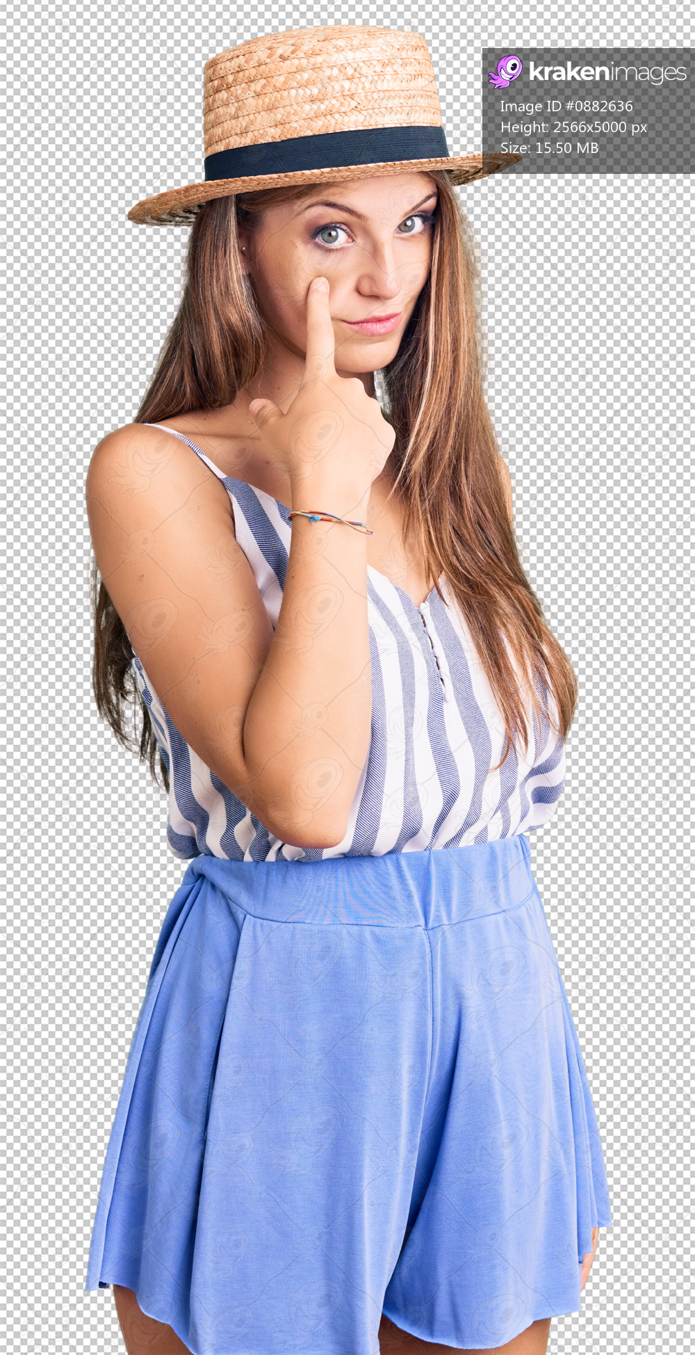 Young beautiful blonde woman wearing summer hat pointing to the eye watching you gesture, suspicious expression
