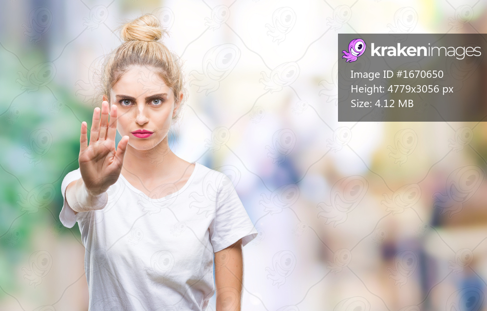 Young beautiful blonde woman wearing white t-shirt over isolated background doing stop sing with palm of the hand. Warning expression with negative and serious gesture on the face. - Kraken Images