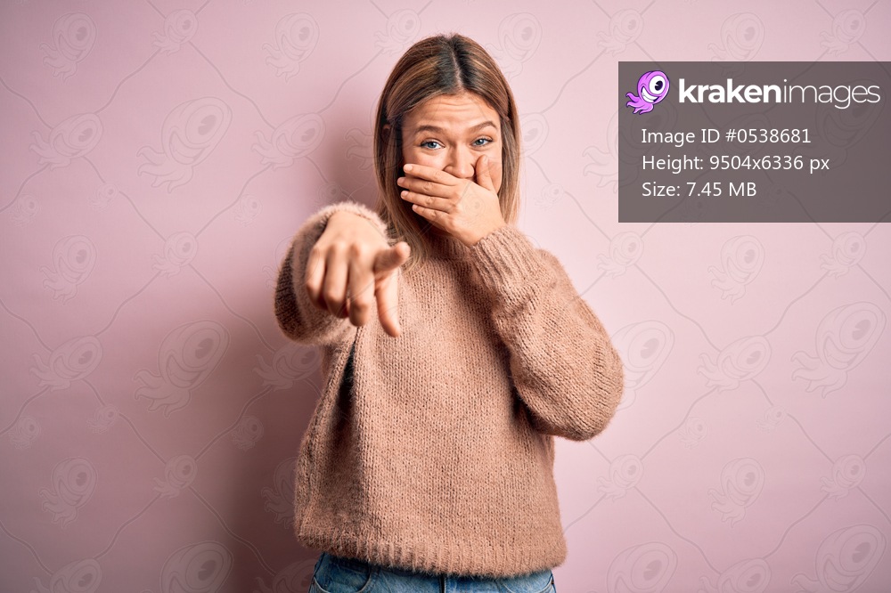 Young beautiful blonde woman wearing winter wool sweater over pink isolated background laughing at you, pointing finger to the camera with hand over mouth, shame expression - Kraken Images
