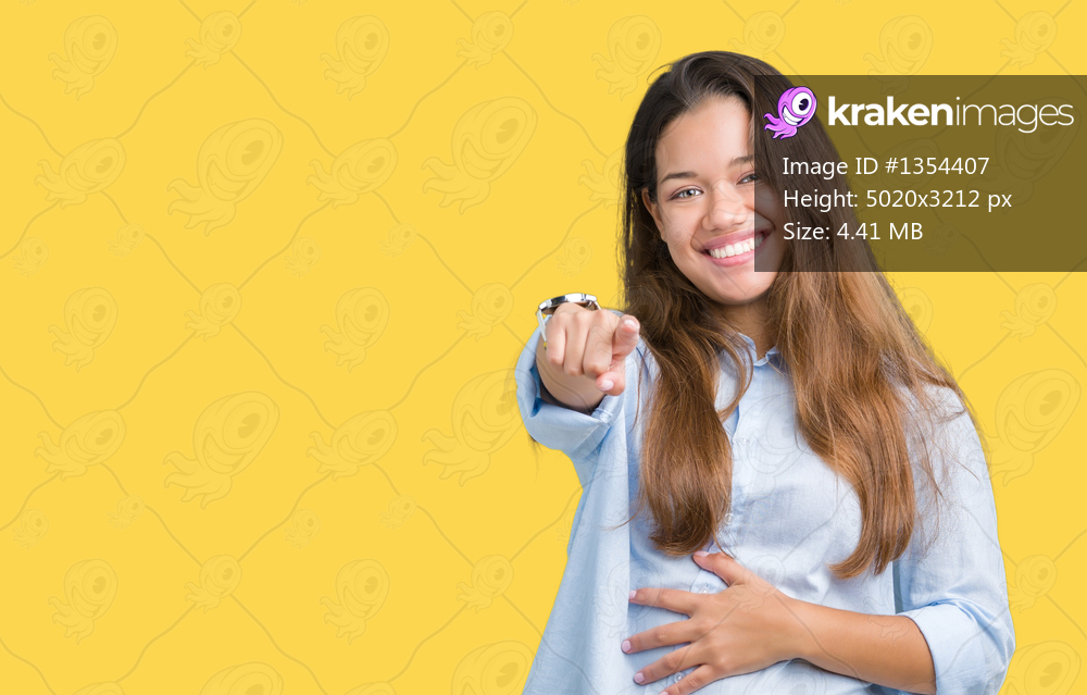 Young beautiful brunette business woman over isolated background Laughing of you, pointing to the camera with finger hand over chest, shame expression