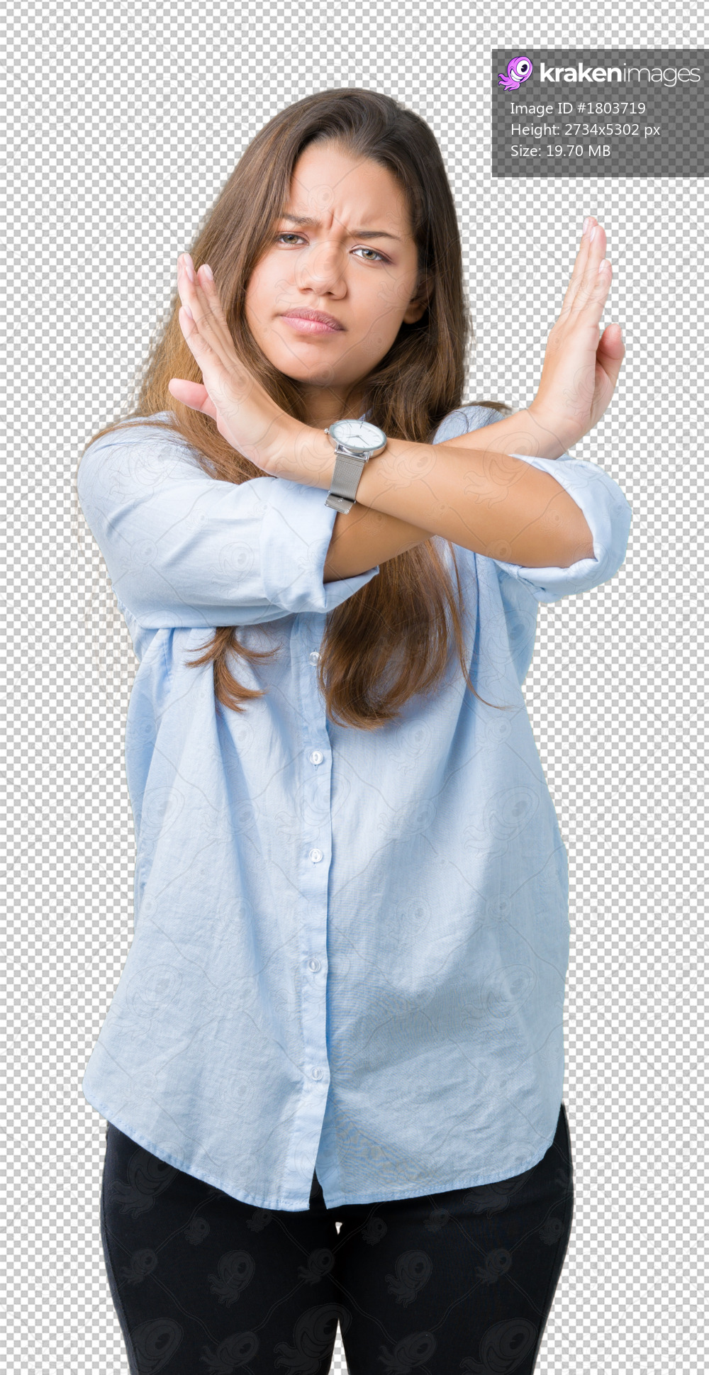 Young beautiful brunette business woman over isolated background Rejection expression crossing arms doing negative sign, angry face