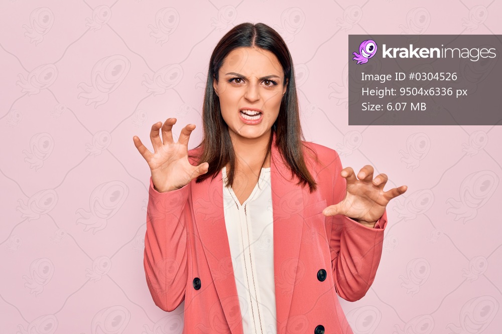 Young beautiful brunette businesswoman wearing elegant jacket over isolated pink background smiling funny doing claw gesture as cat, aggressive and sexy expression