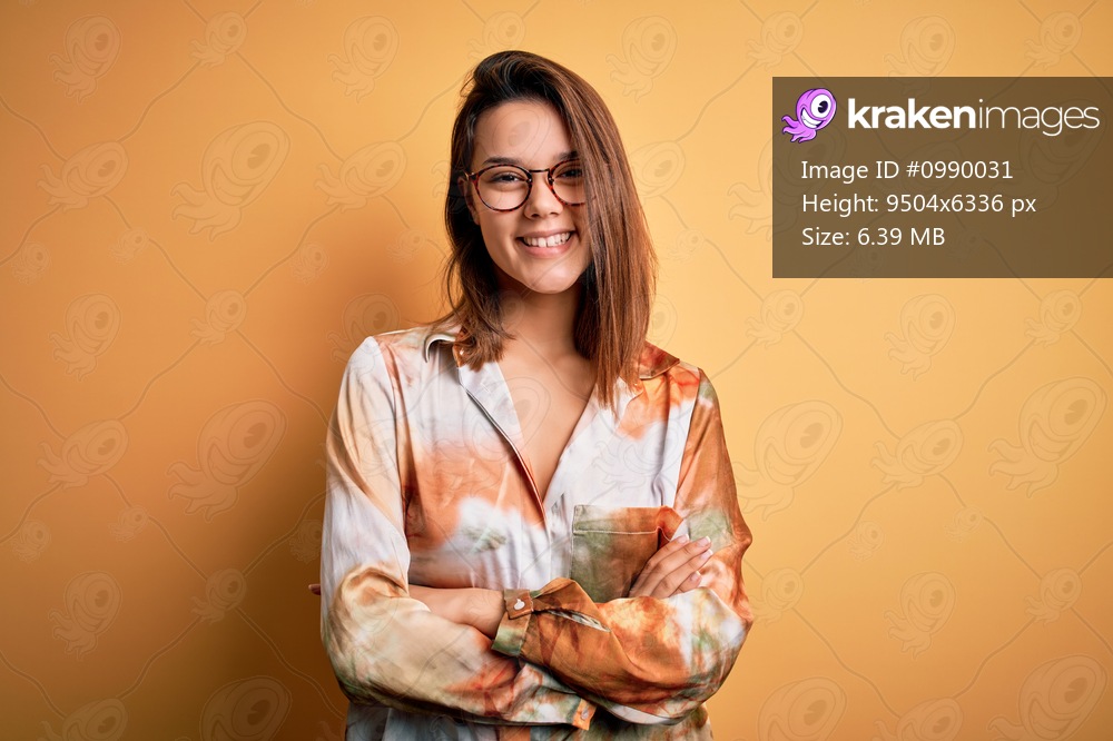 Young beautiful brunette girl wearing casual shirt and glasses over isolated yellow background happy face smiling with crossed arms looking at the camera. Positive person. - Kraken Images