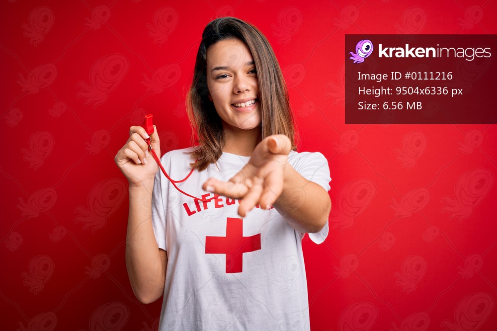 Young beautiful brunette lifeguard girl wearing t-shirt with red cross using whistle smiling cheerful offering palm hand giving assistance and acceptance. - Kraken Images