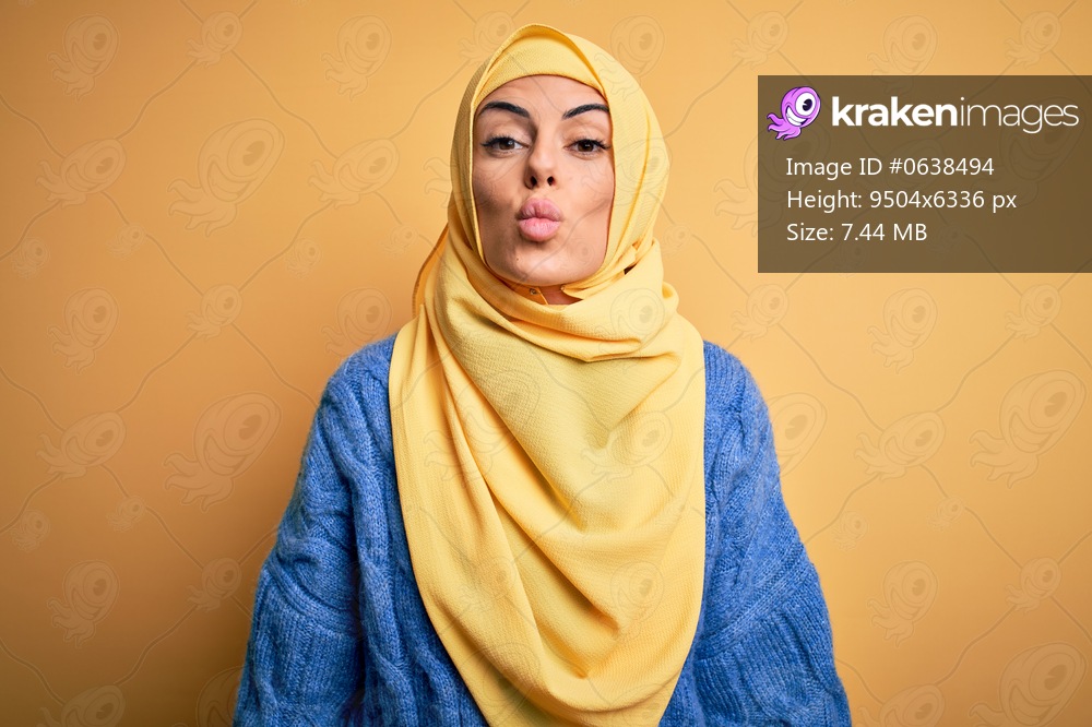 Young beautiful brunette muslim woman wearing arab hijab over isolated yellow background looking at the camera blowing a kiss on air being lovely and sexy. Love expression. - Kraken Images