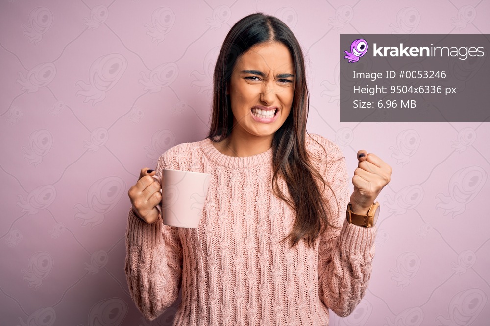Young beautiful brunette woman drinking cup of coffee over isolated pink background annoyed and frustrated shouting with anger, crazy and yelling with raised hand, anger concept - Kraken Images