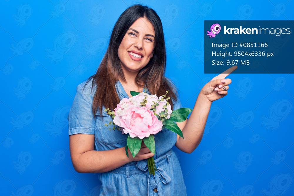 Young beautiful brunette woman holding bouquet of pink flowers over isolated blue background smiling happy pointing with hand and finger to the side