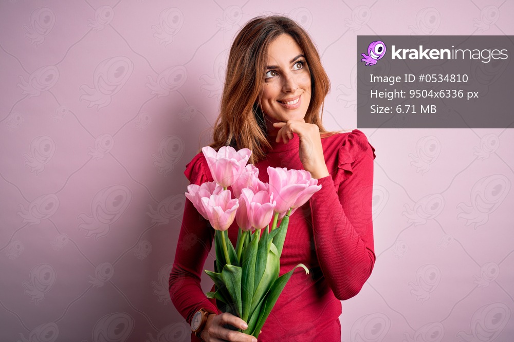 Young beautiful brunette woman holding bouquet of pink tulips over isolated background with hand on chin thinking about question, pensive expression. Smiling and thoughtful face. Doubt concept. - Kraken Images