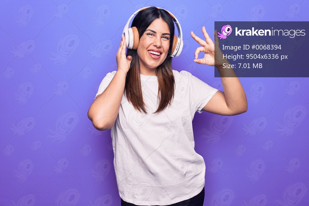Young beautiful brunette woman listening to music using headphones over purple background doing ok sign with fingers, smiling friendly gesturing excellent symbol - Kraken Images