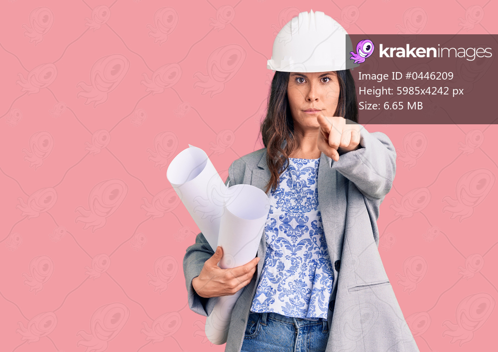 Young beautiful brunette woman wearing architect hardhat holding blueprint pointing with finger to the camera and to you, confident gesture looking serious - Kraken Images