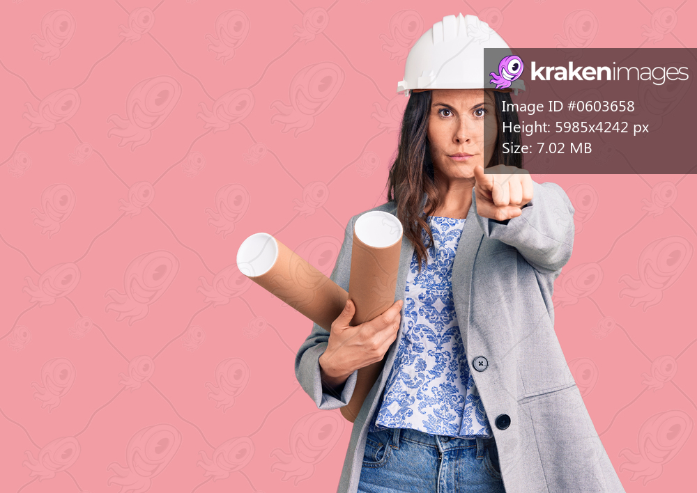 Young beautiful brunette woman wearing architect hardhat holding blueprint pointing with finger to the camera and to you, confident gesture looking serious - Kraken Images