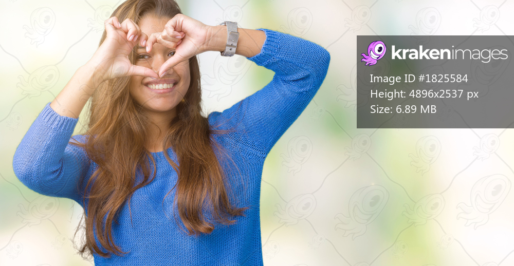 Young beautiful brunette woman wearing blue sweater over isolated background Doing heart shape with hand and fingers smiling looking through sign