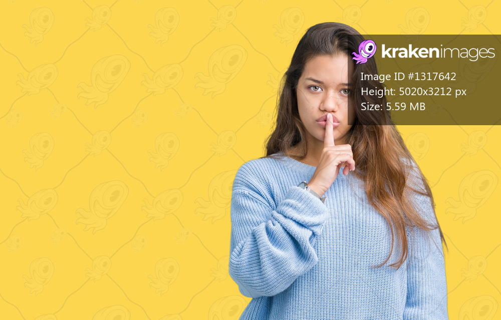 Young beautiful brunette woman wearing blue winter sweater over isolated background asking to be quiet with finger on lips. Silence and secret concept. - Kraken Images