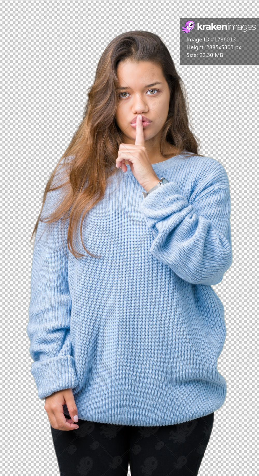 Young beautiful brunette woman wearing blue winter sweater over isolated background asking to be quiet with finger on lips. Silence and secret concept. - Kraken Images