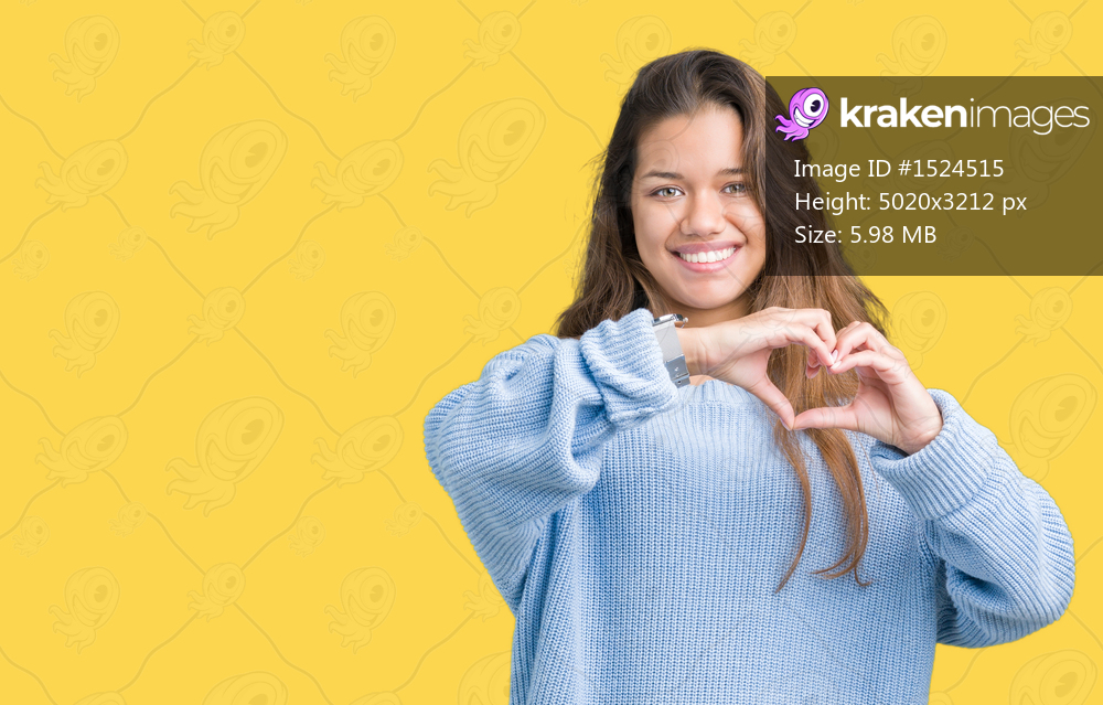 Young beautiful brunette woman wearing blue winter sweater over isolated background smiling in love showing heart symbol and shape with hands. Romantic concept. - Kraken Images