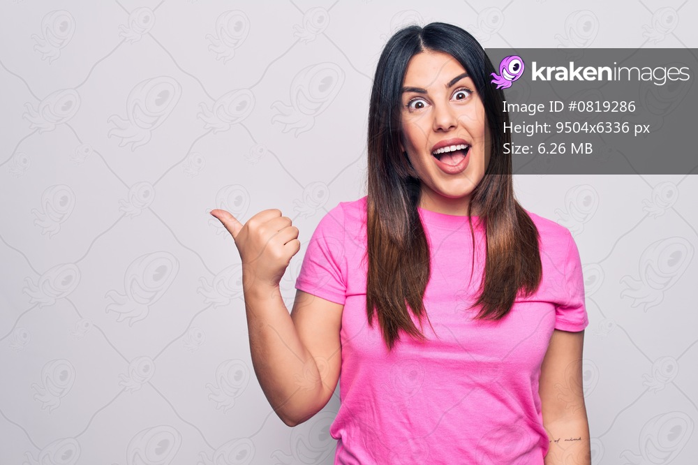 Young beautiful brunette woman wearing casual pink t-shirt standing over white background smiling with happy face looking and pointing to the side with thumb up. - Kraken Images