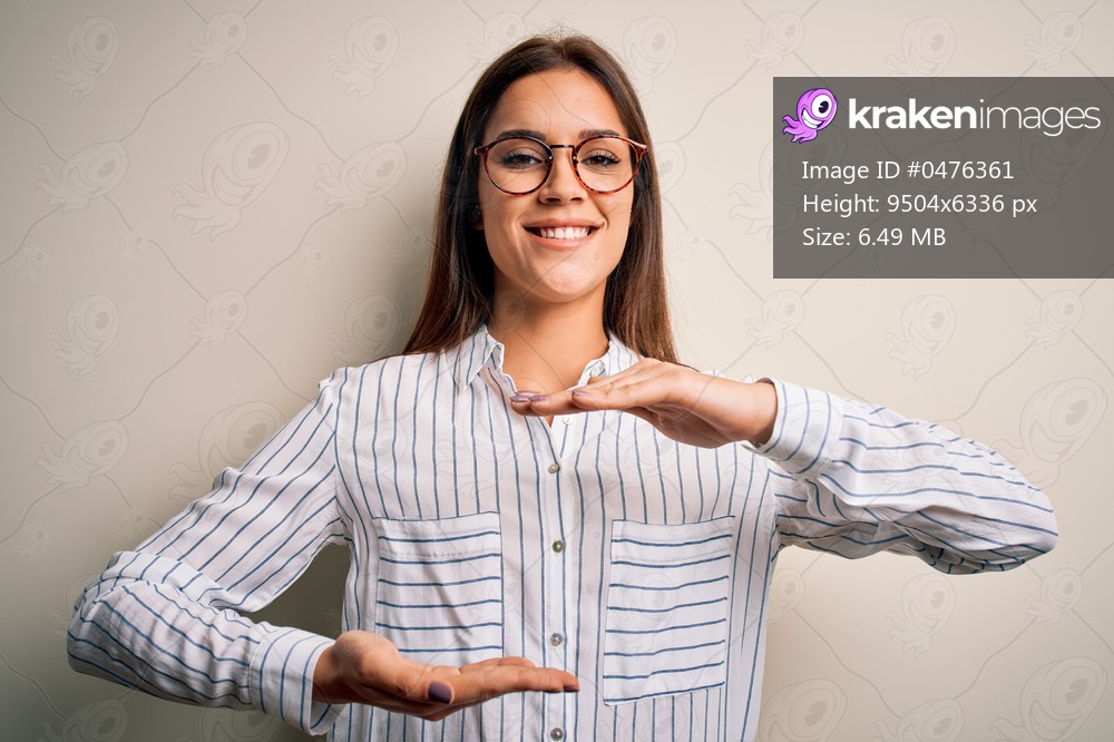 Young beautiful brunette woman wearing casual shirt and glasses over white background gesturing with hands showing big and large size sign, measure symbol. Smiling looking at the camera. Measuring concept. - Kraken Images