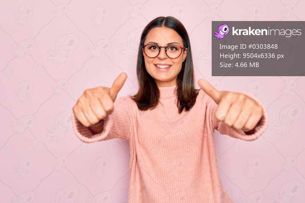 Young beautiful brunette woman wearing casual sweater and glasses over pink background approving doing positive gesture with hand, thumbs up smiling and happy for success. Winner gesture. - Kraken Images