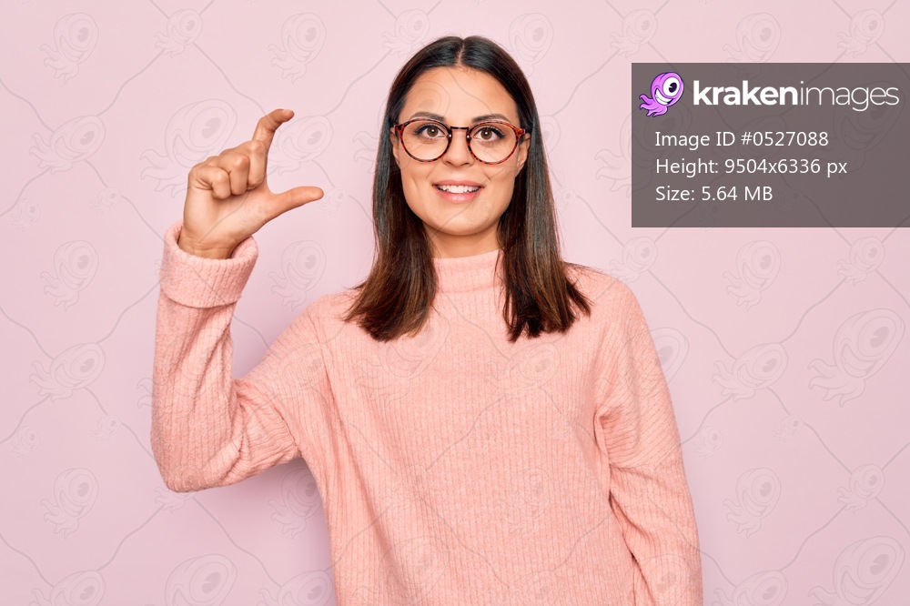 Young beautiful brunette woman wearing casual sweater and glasses over pink background smiling and confident gesturing with hand doing small size sign with fingers looking and the camera. Measure concept. - Kraken Images