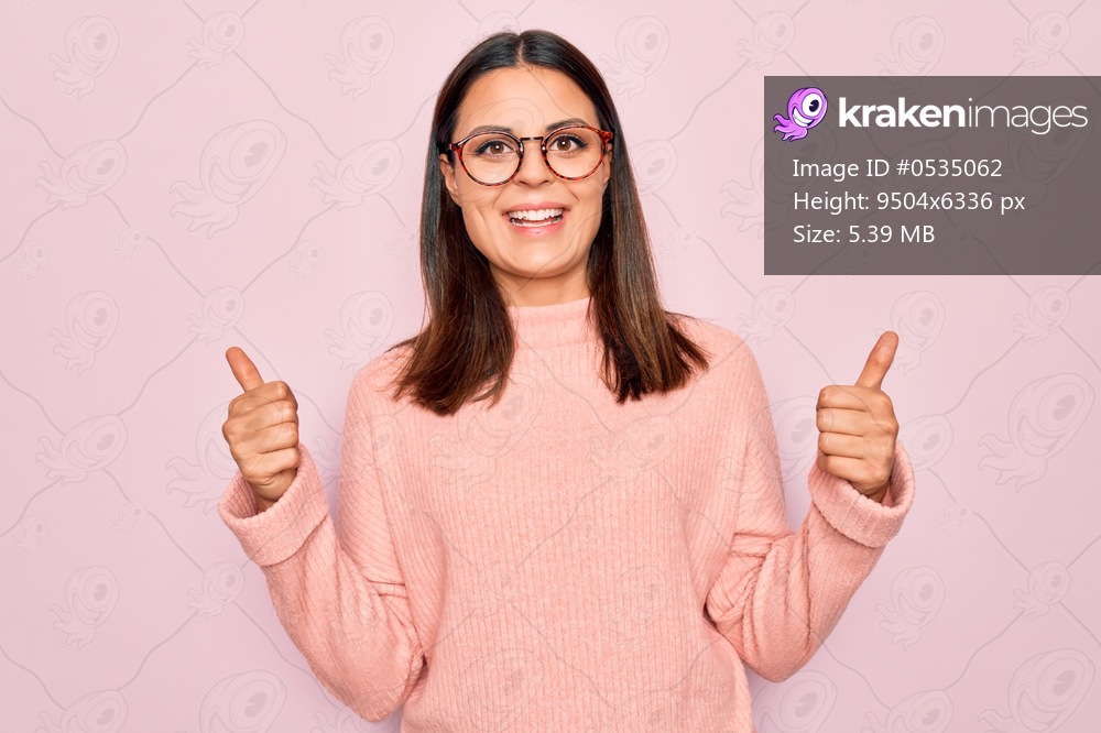 Young beautiful brunette woman wearing casual sweater and glasses over pink background success sign doing positive gesture with hand, thumbs up smiling and happy. Cheerful expression and winner gesture. - Kraken Images