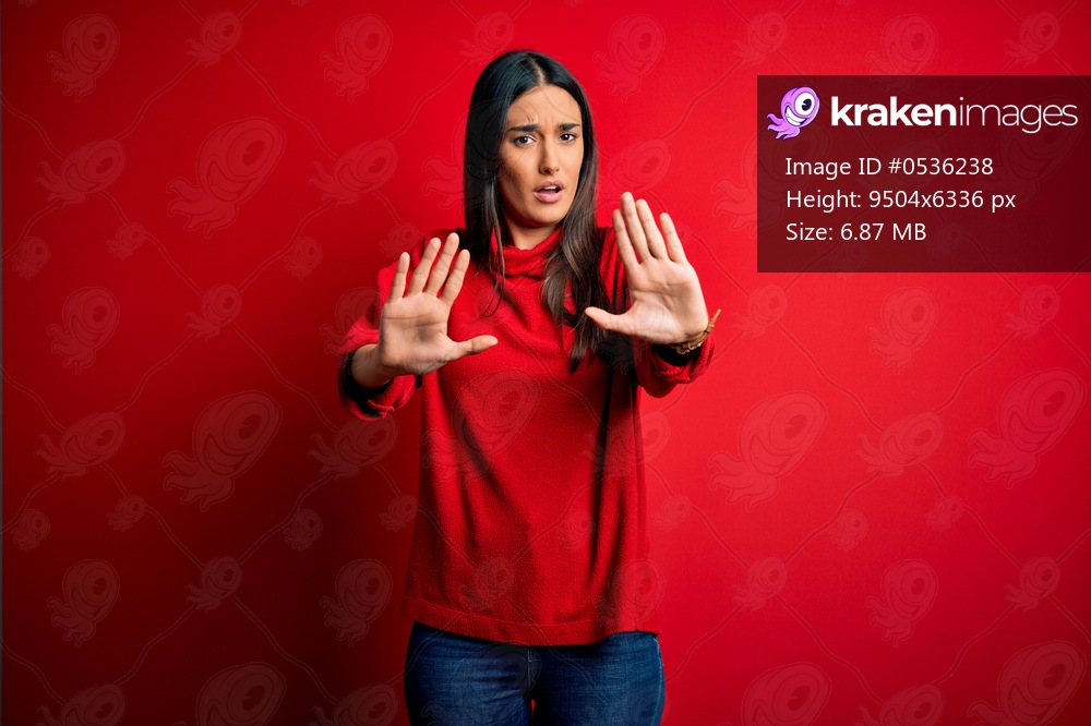 Young beautiful brunette woman wearing casual sweater over isolated red background doing stop gesture with hands palms, angry and frustration expression - Kraken Images