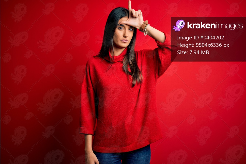 Young beautiful brunette woman wearing casual sweater over isolated red background making fun of people with fingers on forehead doing loser gesture mocking and insulting. - Kraken Images