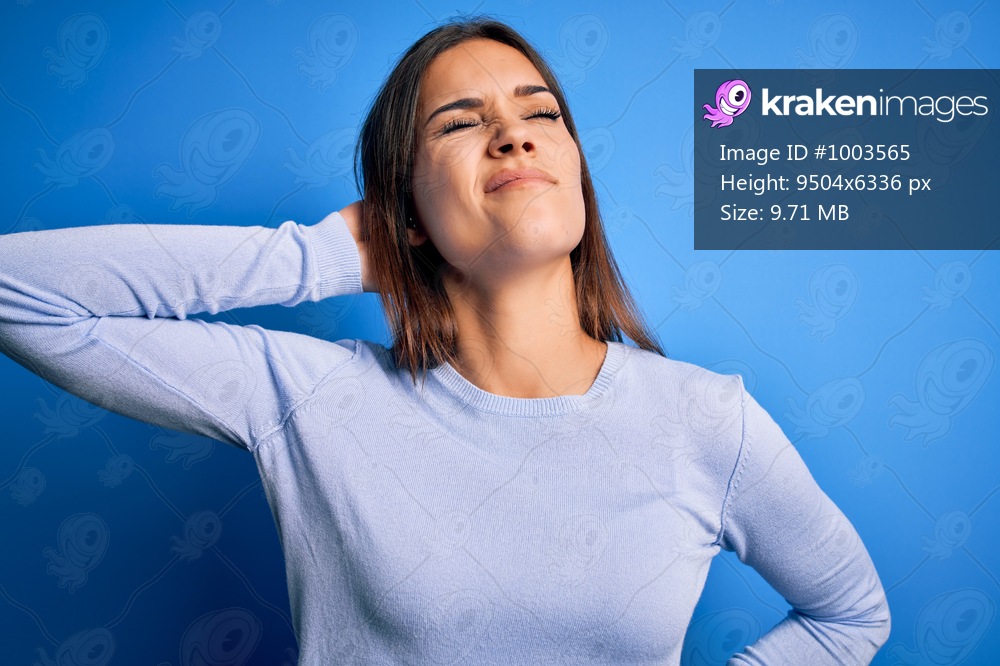 Young beautiful brunette woman wearing casual sweater standing over blue background Suffering of neck ache injury, touching neck with hand, muscular pain - Kraken Images