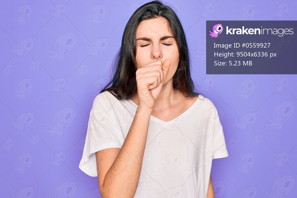 Young beautiful brunette woman wearing casual white t-shirt over purple background feeling unwell and coughing as symptom for cold or bronchitis. Health care concept. - Kraken Images
