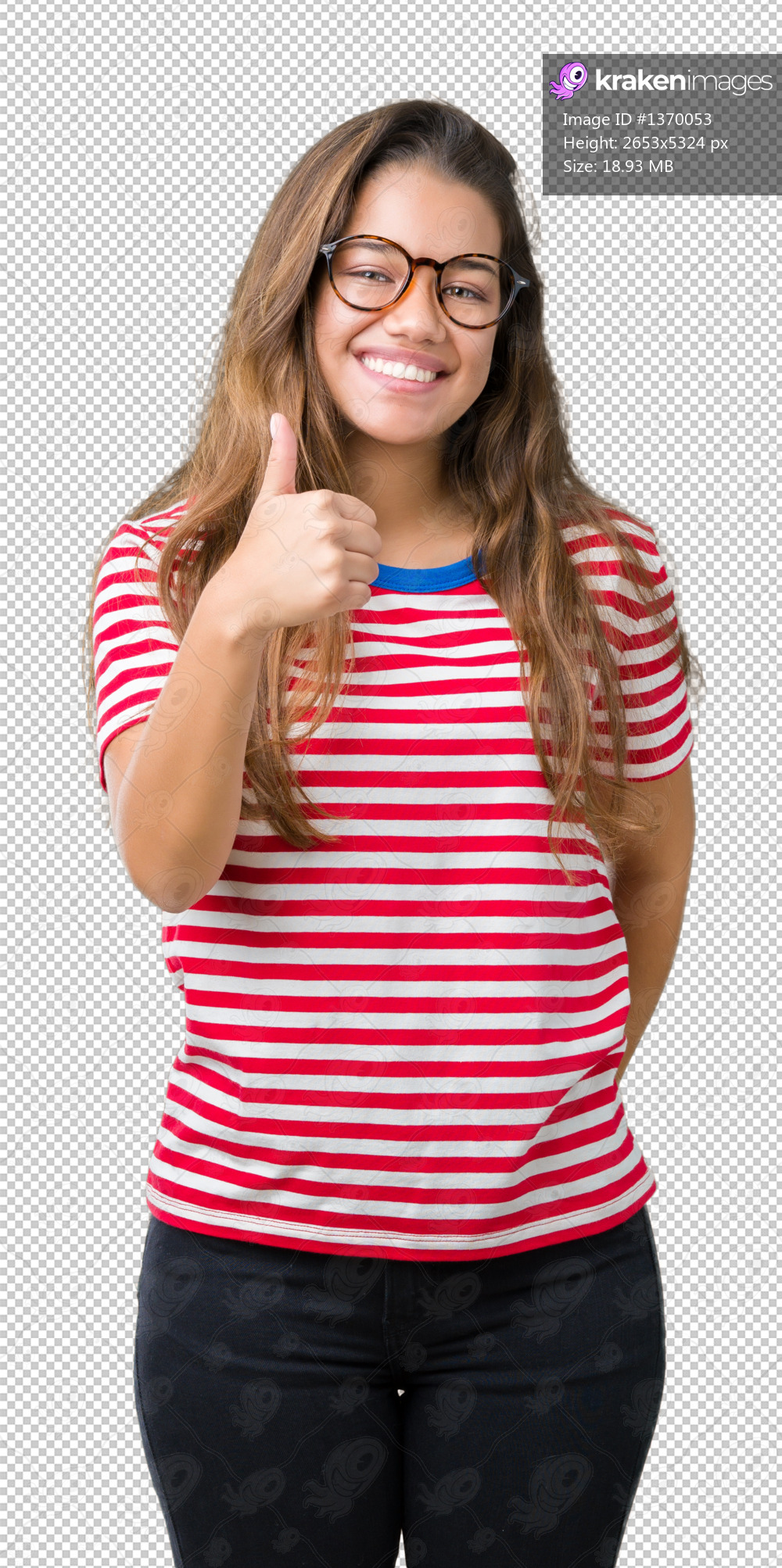 Young beautiful brunette woman wearing glasses and stripes t-shirt over isolated background doing happy thumbs up gesture with hand. Approving expression looking at the camera with showing success. - Kraken Images