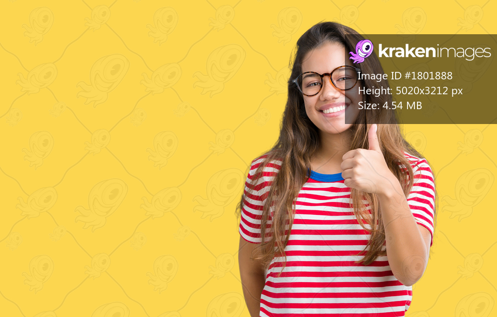 Young beautiful brunette woman wearing glasses and stripes t-shirt over isolated background doing happy thumbs up gesture with hand. Approving expression looking at the camera with showing success. - Kraken Images