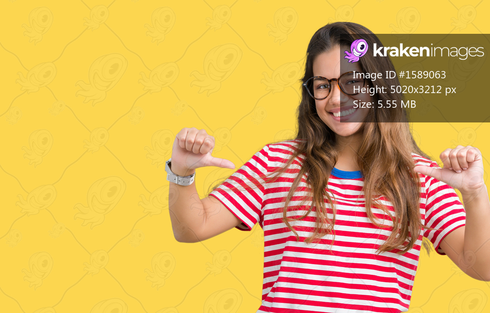 Young beautiful brunette woman wearing glasses and stripes t-shirt over isolated background looking confident with smile on face, pointing oneself with fingers proud and happy. - Kraken Images