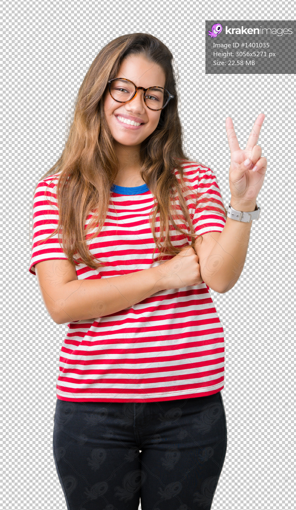Young beautiful brunette woman wearing glasses and stripes t-shirt over isolated background smiling with happy face winking at the camera doing victory sign. Number two. - Kraken Images
