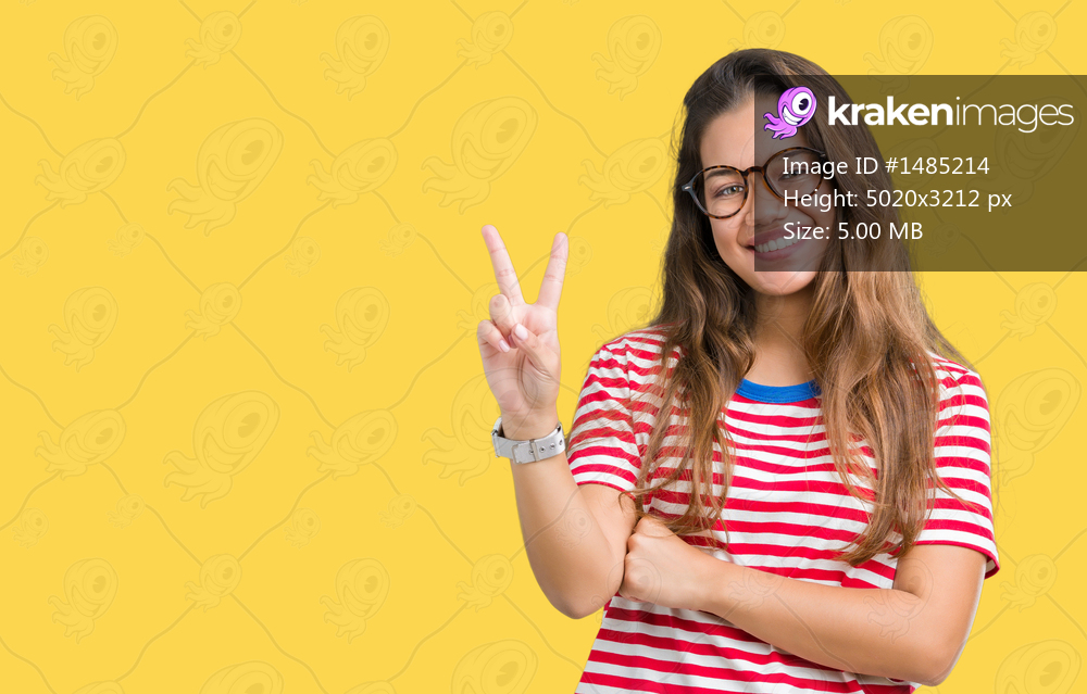 Young beautiful brunette woman wearing glasses and stripes t-shirt over isolated background smiling with happy face winking at the camera doing victory sign. Number two. - Kraken Images