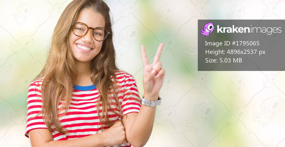Young beautiful brunette woman wearing glasses and stripes t-shirt over isolated background smiling with happy face winking at the camera doing victory sign. Number two. - Kraken Images