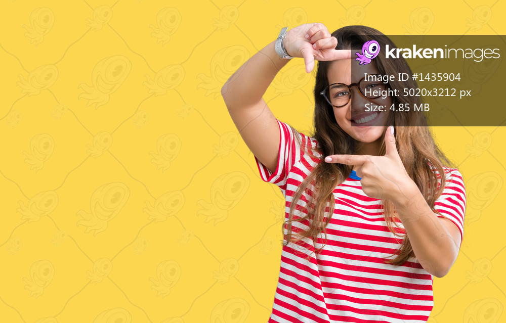 Young beautiful brunette woman wearing glasses and stripes t-shirt over isolated background smiling making frame with hands and fingers with happy face. Creativity and photography concept. - Kraken Images