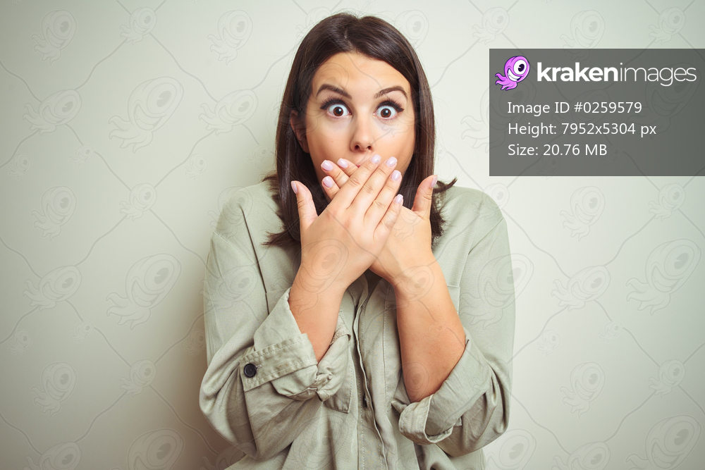 Young beautiful brunette woman wearing green shirt over isolated background shocked covering mouth with hands for mistake. Secret concept.