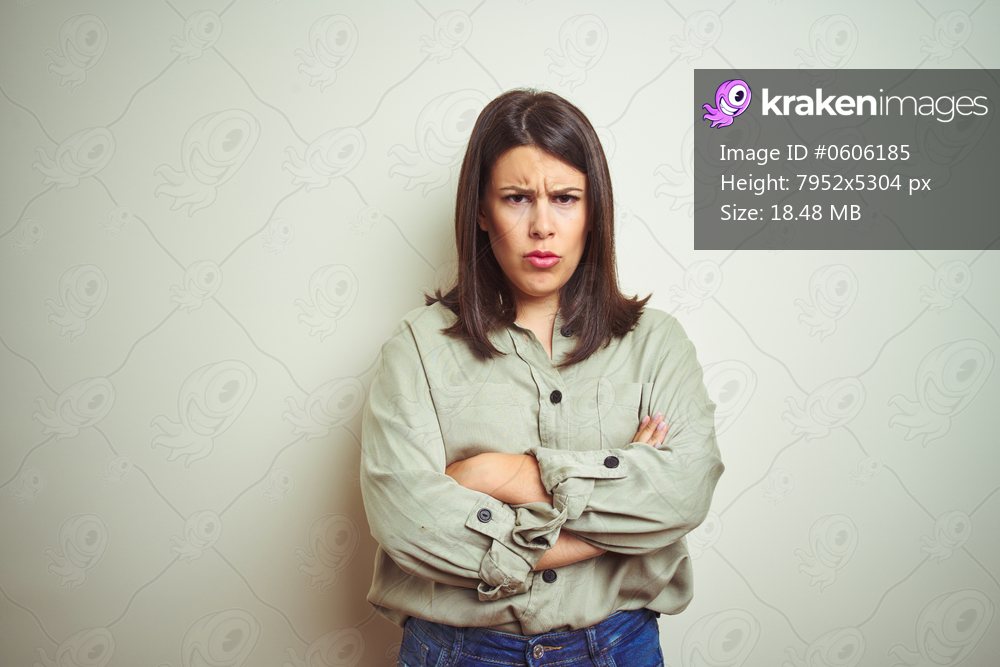Young beautiful brunette woman wearing green shirt over isolated background skeptic and nervous, disapproving expression on face with crossed arms. Negative person. - Kraken Images