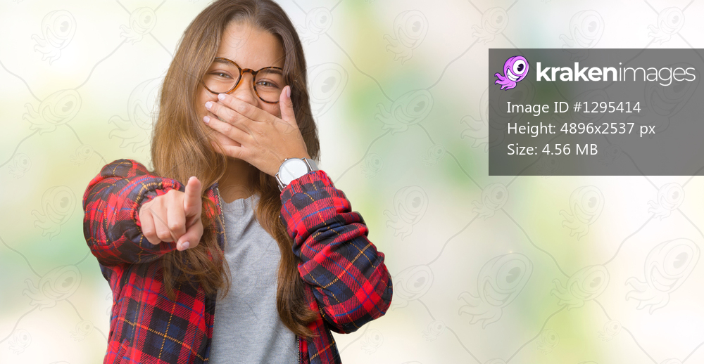 Young beautiful brunette woman wearing jacket and glasses over isolated background Laughing of you, pointing to the camera with finger hand over chest, shame expression - Kraken Images