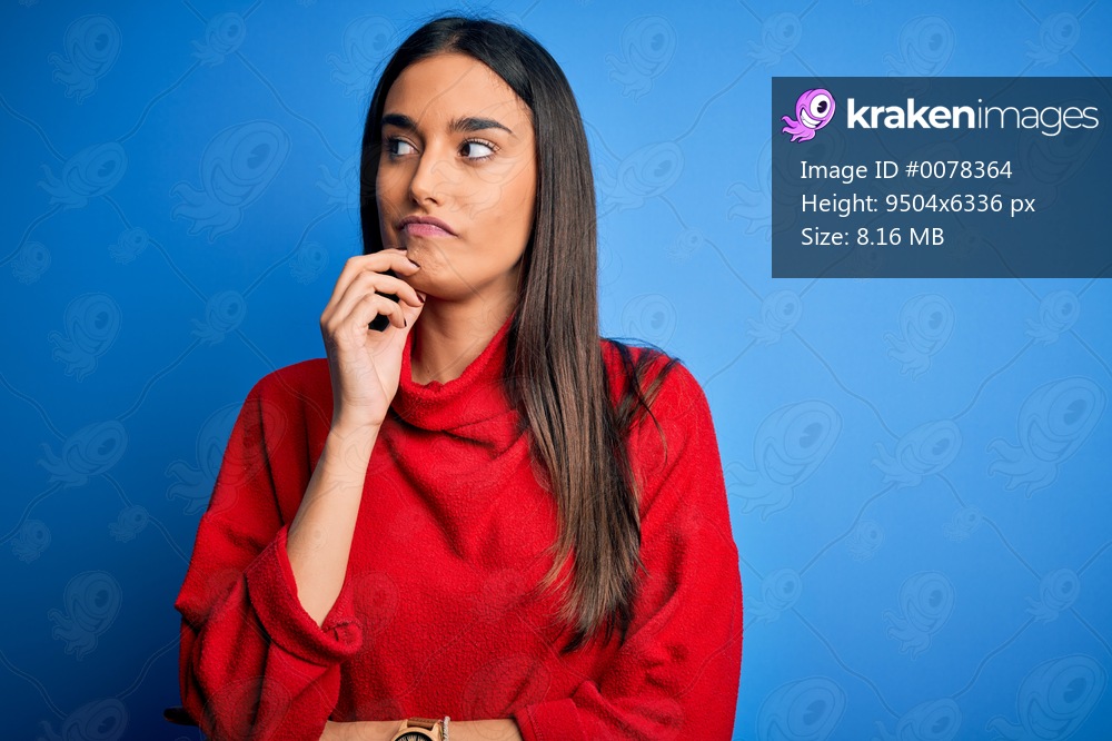 Young beautiful brunette woman wearing red casual sweater over isolated blue background with hand on chin thinking about question, pensive expression. Smiling with thoughtful face. Doubt concept. - Kraken Images