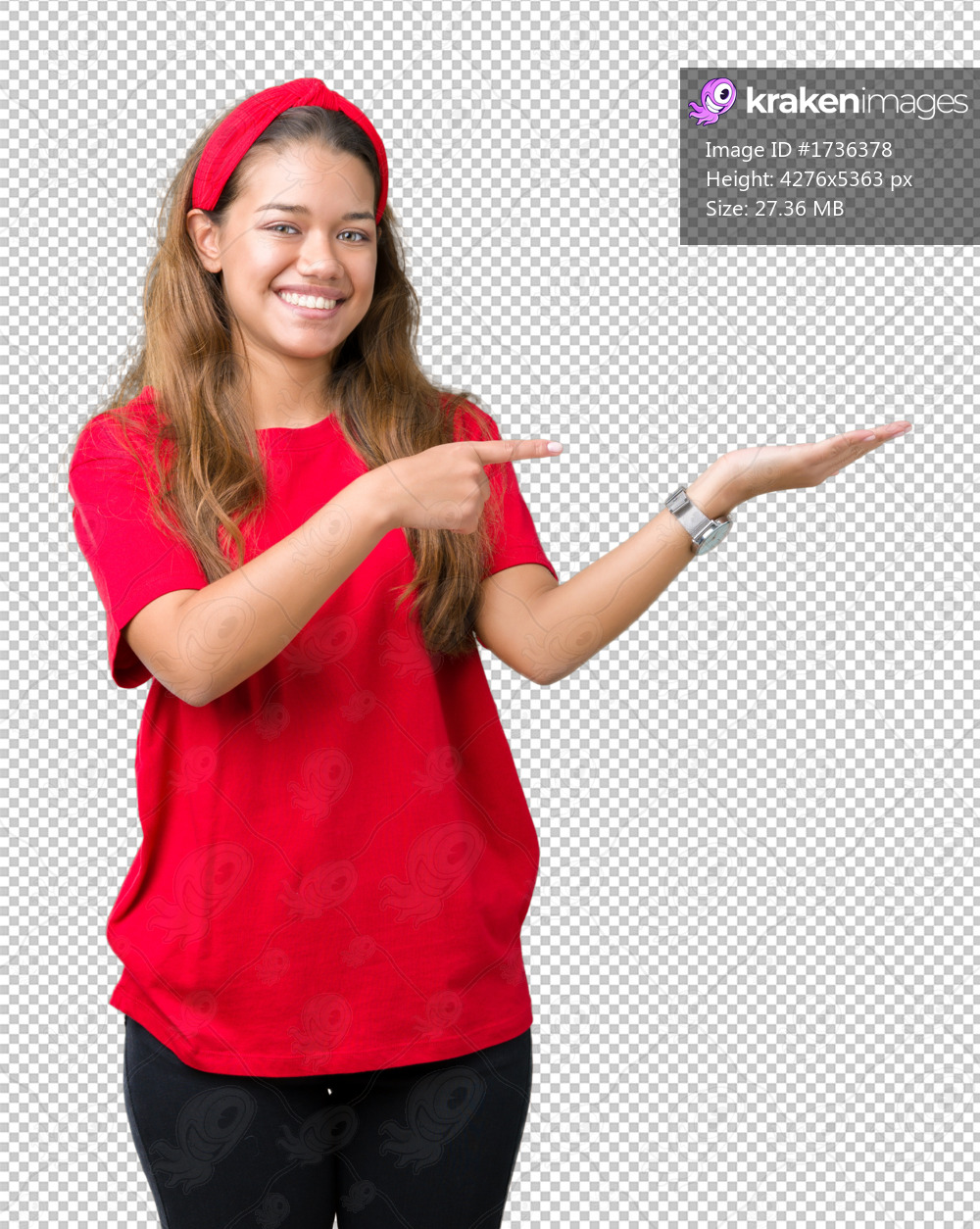Young beautiful brunette woman wearing red t-shirt over isolated background amazed and smiling to the camera while presenting with hand and pointing with finger. - Kraken Images