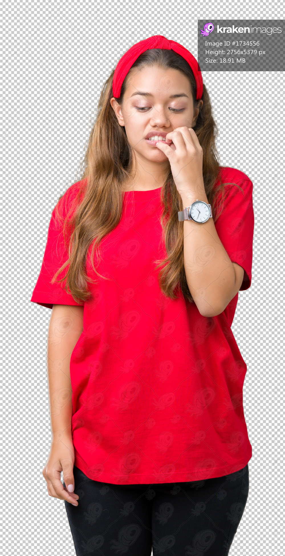 Young beautiful brunette woman wearing red t-shirt over isolated background looking stressed and nervous with hands on mouth biting nails. Anxiety problem. - Kraken Images