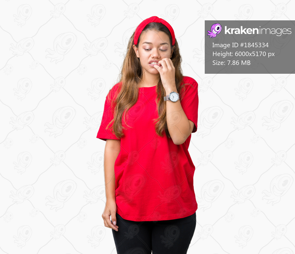 Young beautiful brunette woman wearing red t-shirt over isolated background looking stressed and nervous with hands on mouth biting nails. Anxiety problem. - Kraken Images