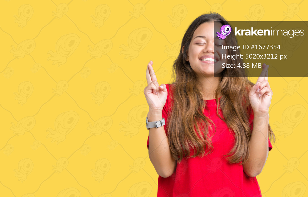 Young beautiful brunette woman wearing red t-shirt over isolated background smiling crossing fingers with hope and eyes closed. Luck and superstitious concept. - Kraken Images