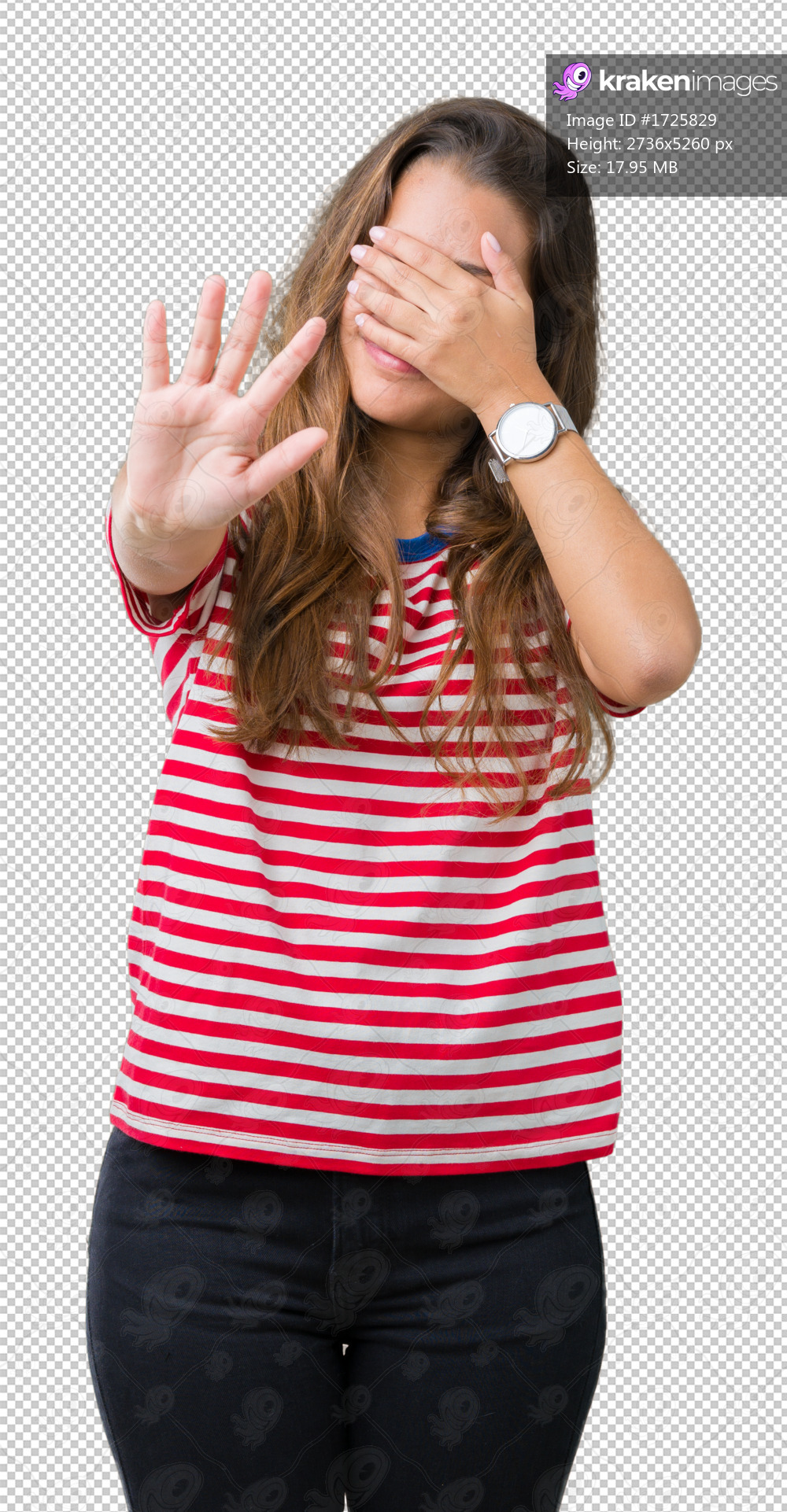 Young beautiful brunette woman wearing stripes t-shirt over isolated background covering eyes with hands and doing stop gesture with sad and fear expression. Embarrassed and negative concept. - Kraken Images