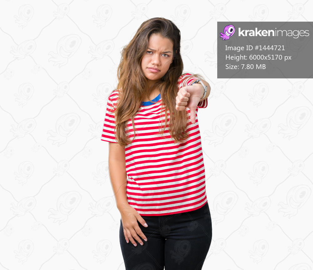 Young beautiful brunette woman wearing stripes t-shirt over isolated background looking unhappy and angry showing rejection and negative with thumbs down gesture. Bad expression. - Kraken Images