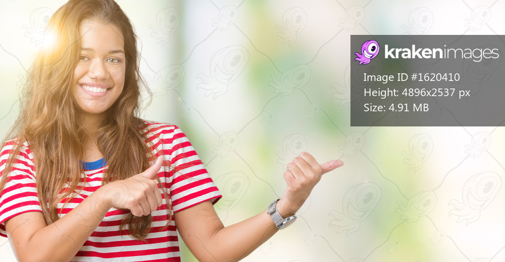 Young beautiful brunette woman wearing stripes t-shirt over isolated background Pointing to the back behind with hand and thumbs up, smiling confident