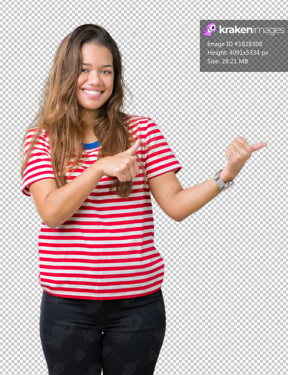 Young beautiful brunette woman wearing stripes t-shirt over isolated background Pointing to the back behind with hand and thumbs up, smiling confident
